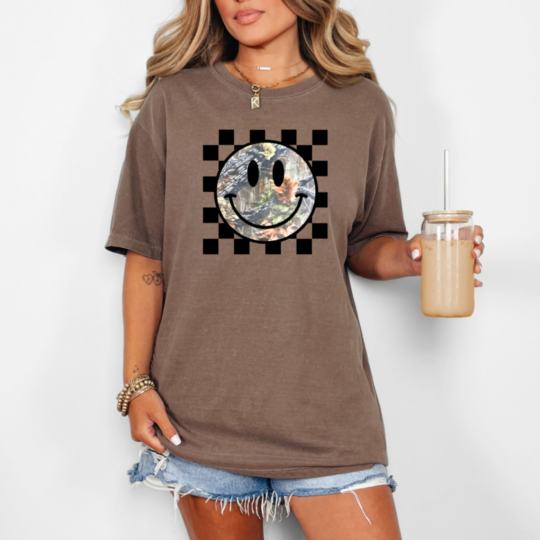 Unleash your inner warrior with our Camo Smiley shirt! Available in either tan or brown, this shirt features a checkered background and a camo smiley face. Perfect for strong and confident women who want to make a statement. Show off your unique style and be the envy of others!