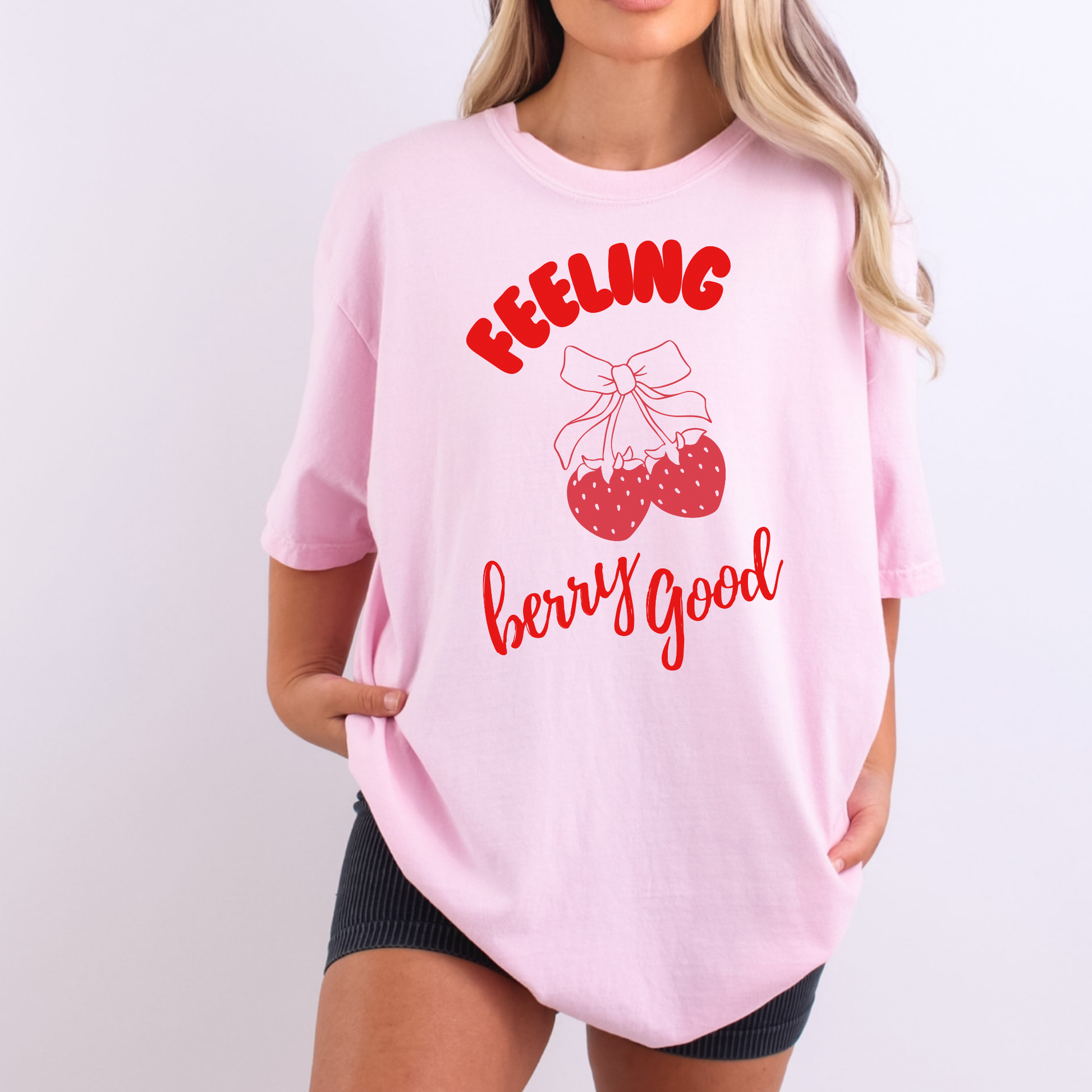 Add a pop of fun to your everyday look with this soft pink graphic tee featuring the cheerful phrase “Feeling Berry Good” and an adorable strawberry bow design. Made for comfort with a relaxed fit, this shirt is perfect for casual days, lounging, or pairing with your favorite shorts or jeans. The bold red graphic stands out beautifully against the blush pink fabric, giving it a fresh, happy vibe.