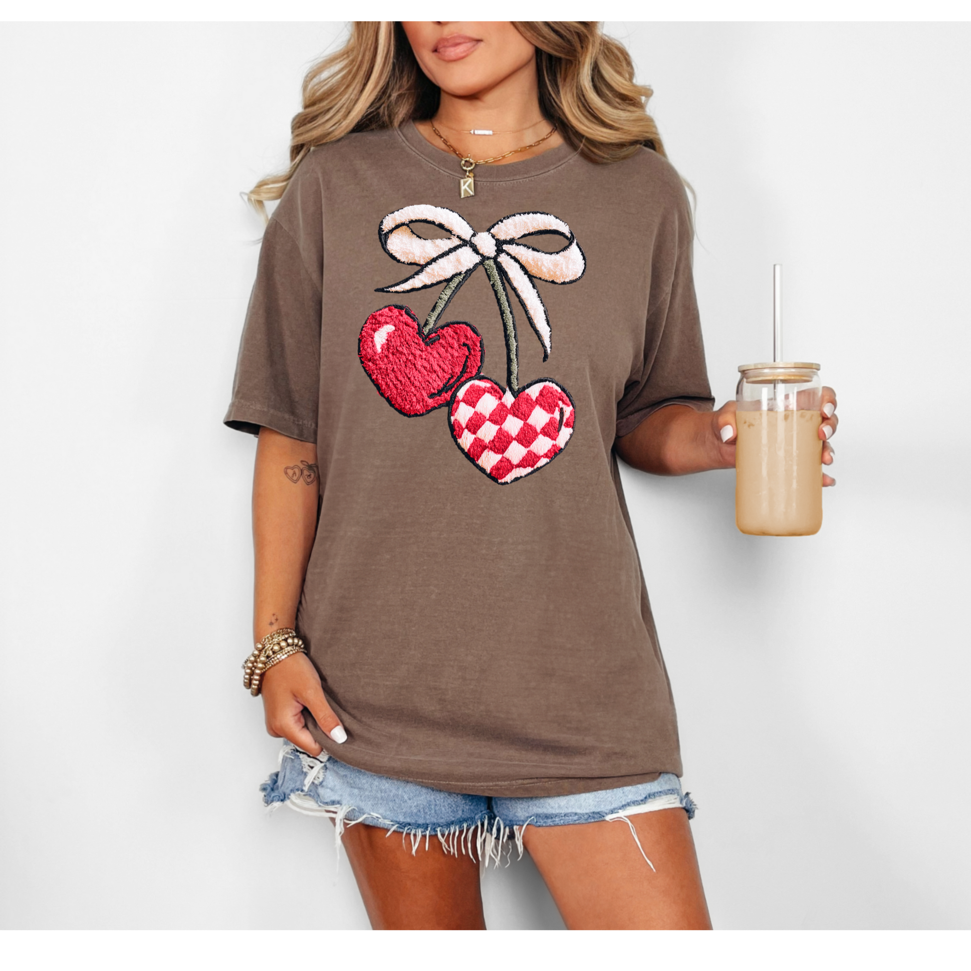 Embrace a playful spirit with our Faux Yarn Checkered Cherries shirt! Featuring a vibrant DTF film print of charming cherries, including one delightfully pink checkered cherry, this piece adds a whimsical touch to any outfit. Let your style shine and spark joy wherever you go!