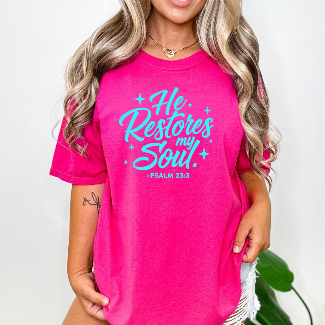 Elevate your wardrobe with our neon pink shirt adorned with the powerful message "He Restores My Soul" in neon blue lettering. Perfect for any woman who believes in the healing power of faith. Let this empowering shirt bring a sense of peace and renewal to your style and soul.
