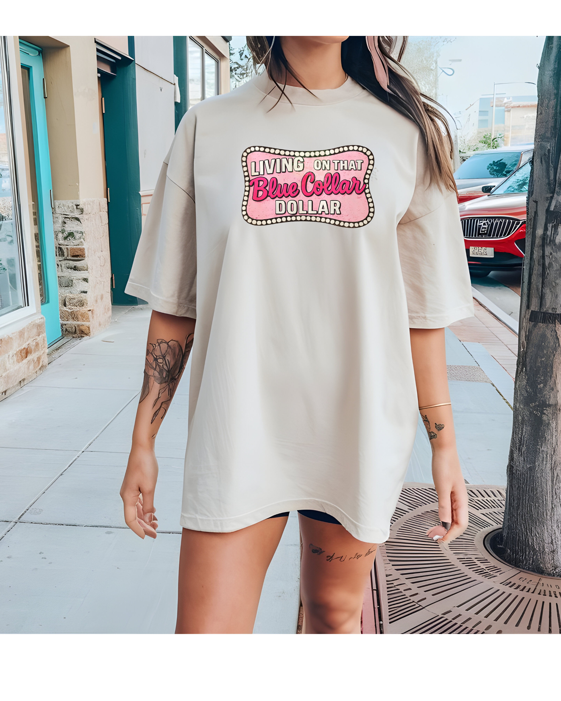 Indulge in a touch of sophistication with our Living on that Blue Collar Dollar shirt. Made for the modern woman, its elegant design and natural color exude luxury. Embrace your hardworking spirit with the empowering message printed on the shirt. Live proudly, in style.